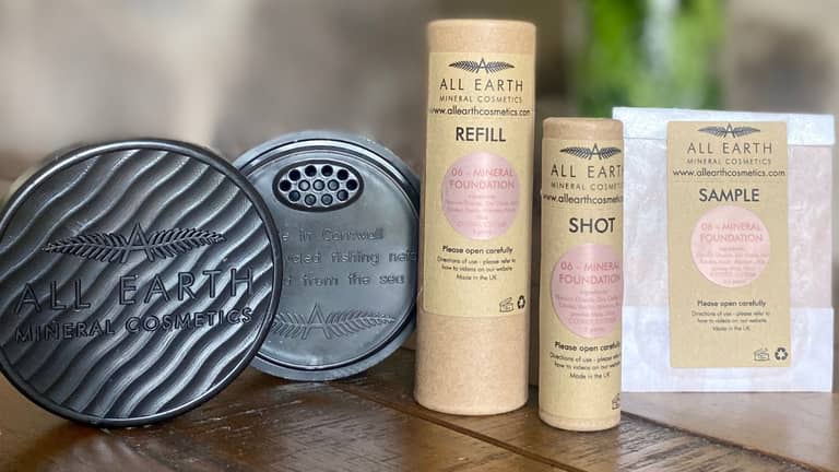 THE PACKAGING With All Earth You can be confident that you are purchasing the very purest mineral make available but we go further, combining this with a range of Eco packaging options. From our unique recycled fishing net pots for life that are used in conjunction with or refills or our shots which can be used as a travel alternative or for adding a pop of colour for you to create your own unique foundation colour, and all the foundations come as samples so you can be confident to try before you buy. And if that was enough we are also AWARD WINNING be presented with the National Health Beauty & Wellness award 2020 for the most Eco conscious cosmetic brand in the UK.
