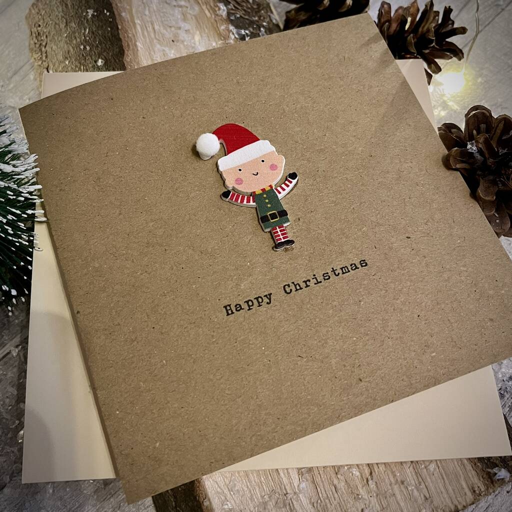 Personalised Wooden Pom Pom Elf Happy Christmas Card
