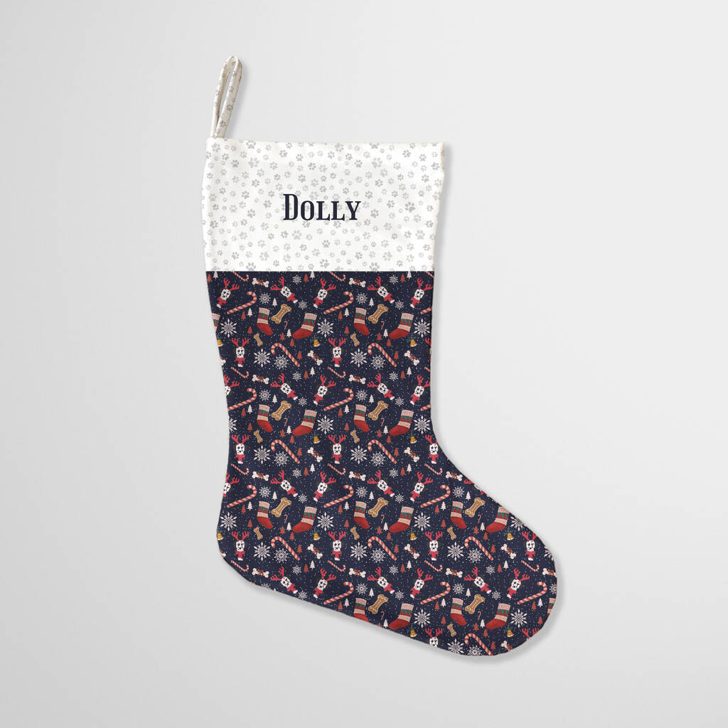 A personalised Christmas stocking in a Dalmatian dog print, available in red, pink, green and navy blue.