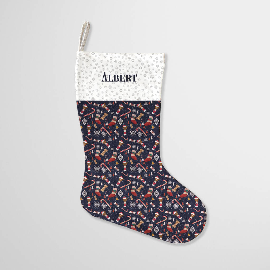 A personalised Christmas stocking in a Greyhound dog print, available in red, pink, green and navy blue.