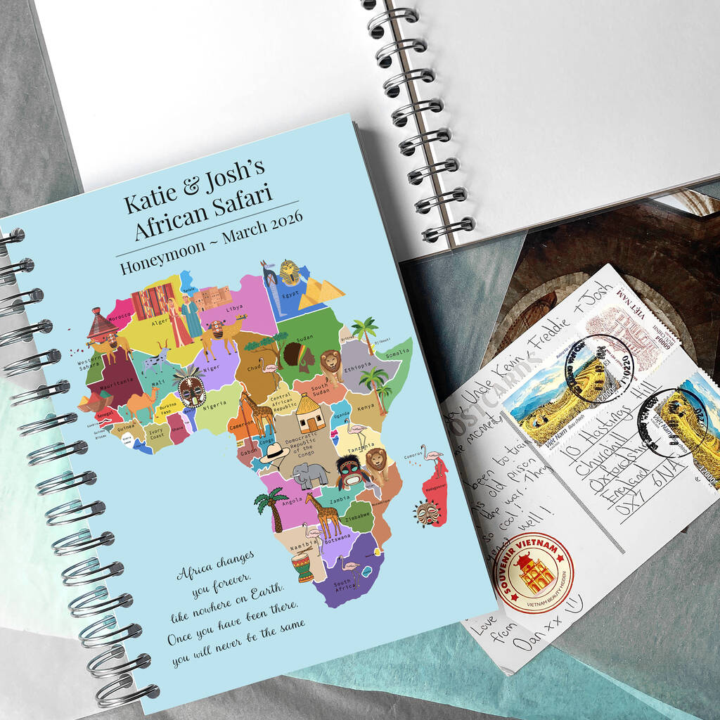 A personalised Africa travel scrapbook which can be used for writing in as well as sticking in photos and other momentos from your trip.