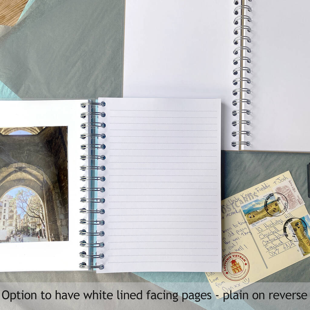 The books have plain black or plain or lined white card pages making the pages suitable for writing, sketching or painting directly onto as well as for mounting photos, tickets, postcards and mementos.