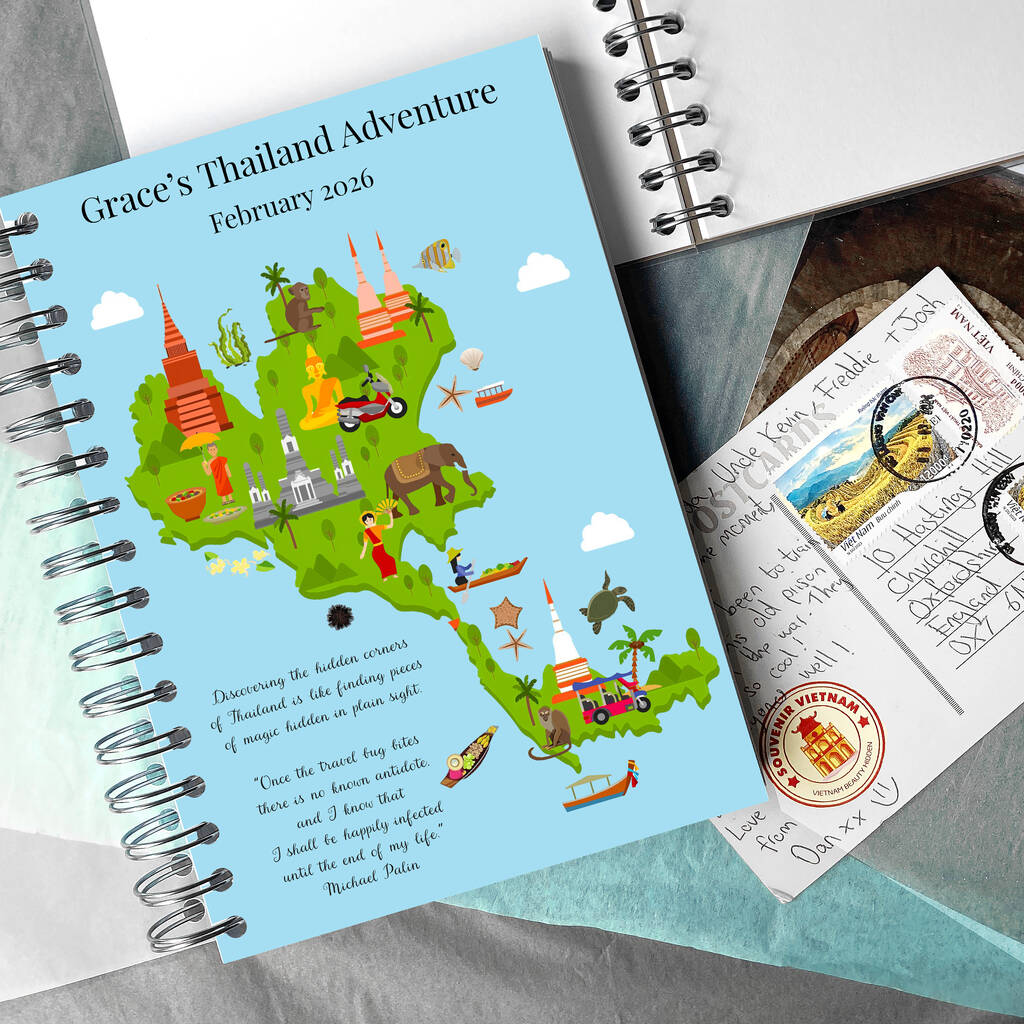 A personalised Thailand travel scrapbook which can be used for writing in as well as sticking in photos and other momentos from your trip.
