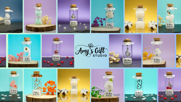 At Amy’s Gift Studio, we specialise in miniature bottled keepsakes that honour anniversaries in a unique and sentimental way. Each tiny glass bottle contains a carefully selected charm symbolising the traditional gift for a specific anniversary year—paper for the 1st, wood for the 5th, tin for the 10th, and beyond. These keepsakes are then personalised with the couple’s wedding or anniversary date, turning them into timeless treasures that capture the essence of each milestone.