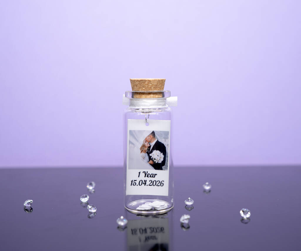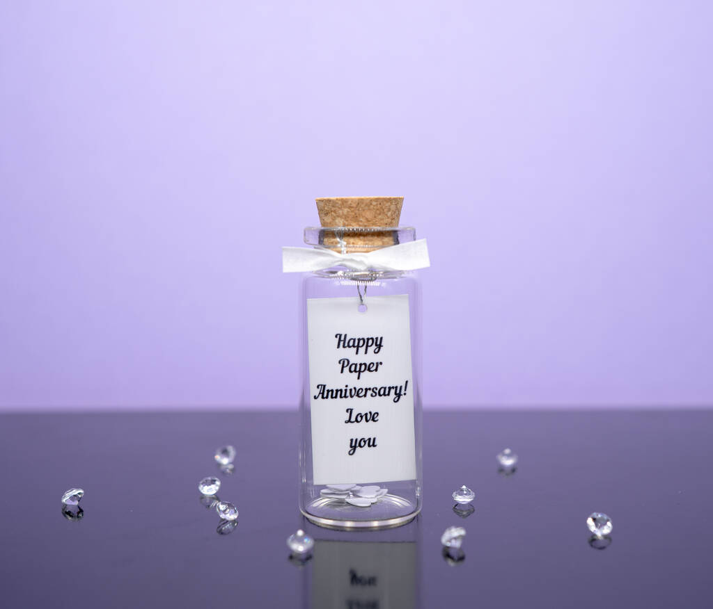This tiny glass bottle features your photo on the front, and personalised message on the back— symbolising the traditional paper theme of 1st anniversary.