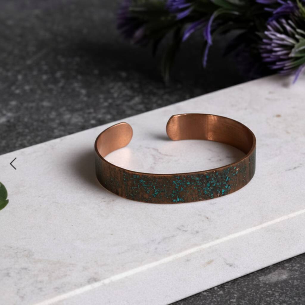 A handcrafted solid copper cuff featuring a stunning natural verdigris patina for timeless artisan elegance.The Solid Copper Cuff Bracelet with Natural Verdigris Patina combines raw nature and refined craftsmanship. Each piece is handmade from 100% solid copper and naturally oxidized to reveal unique turquoise and teal patterns — no two are ever the same. The inner side remains smooth and polished, ensuring comfort and maintaining copper’s natural properties. Perfect for those who appreciate individuality and artisanal detail, it pairs beautifully with both modern and bohemian styles.