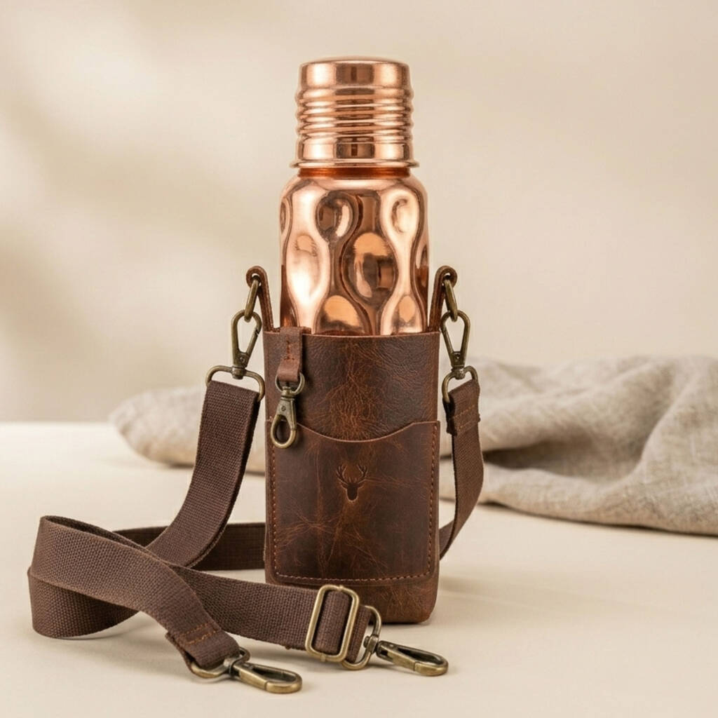 A heritage-inspired copper water bottle paired with a structured leather crossbody bag — practical, characterful and perfect for everyday mindful livingCelebrate timeless craftsmanship with this coordinated two-piece set, combining a 750ml hammered copper bottle and a genuine leather crossbody bag. The sculptural hammered texture enhances grip while naturally developing a rich, unique patina over time. The structured leather bag features antique-tone hardware and an adjustable strap for effortless hands-free wear. Blending rustic warmth with contemporary practicality, this versatile set is ideal for commuters, travellers, festival-goers and anyone embracing a slower, more mindful lifestyle.