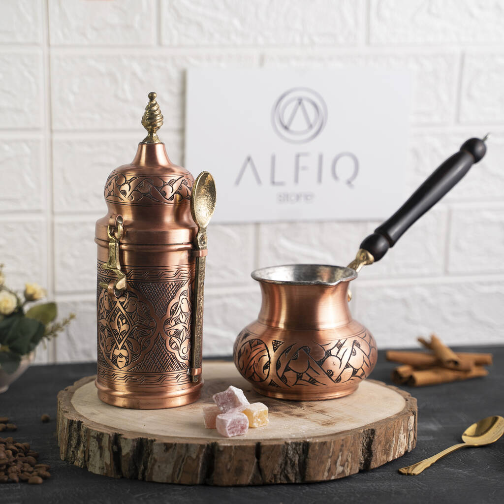 This complete coffee set offers timeless elegance and everyday practicality. The handcrafted copper pot is designed for brewing rich, aromatic Turkish coffee with precision, while the airtight container ensures your grounds or beans stay fresh and full of flavor. The included brass spoon adds a luxurious finishing touch, perfect for measuring with style.