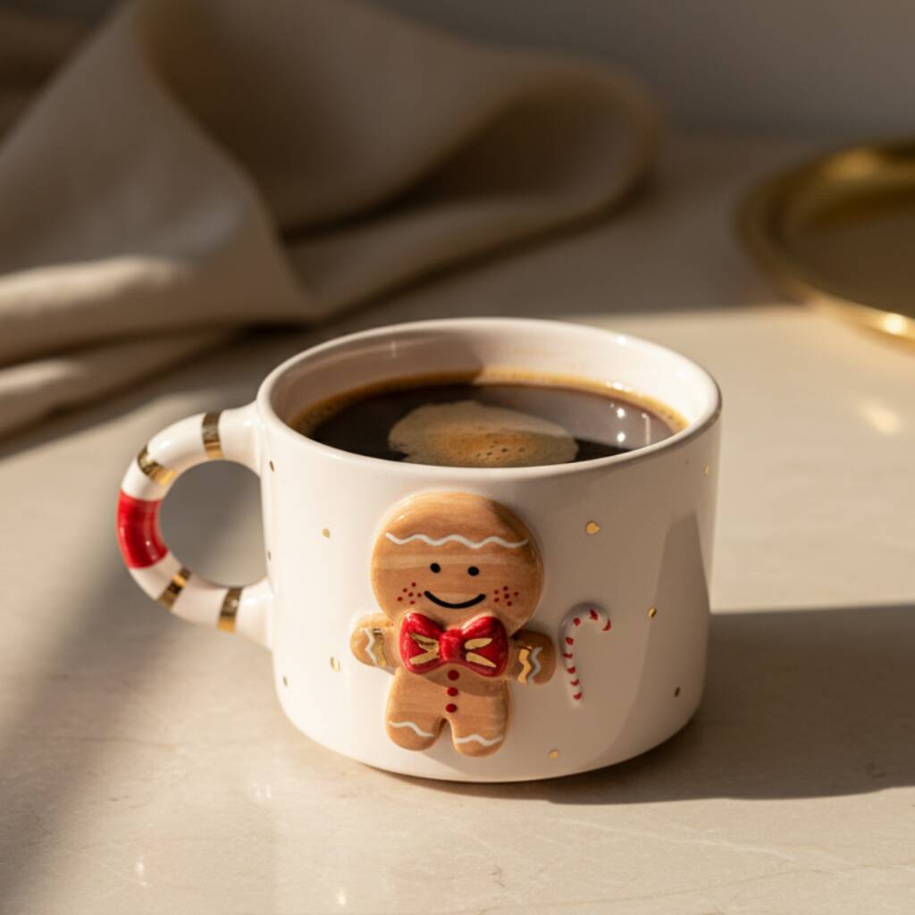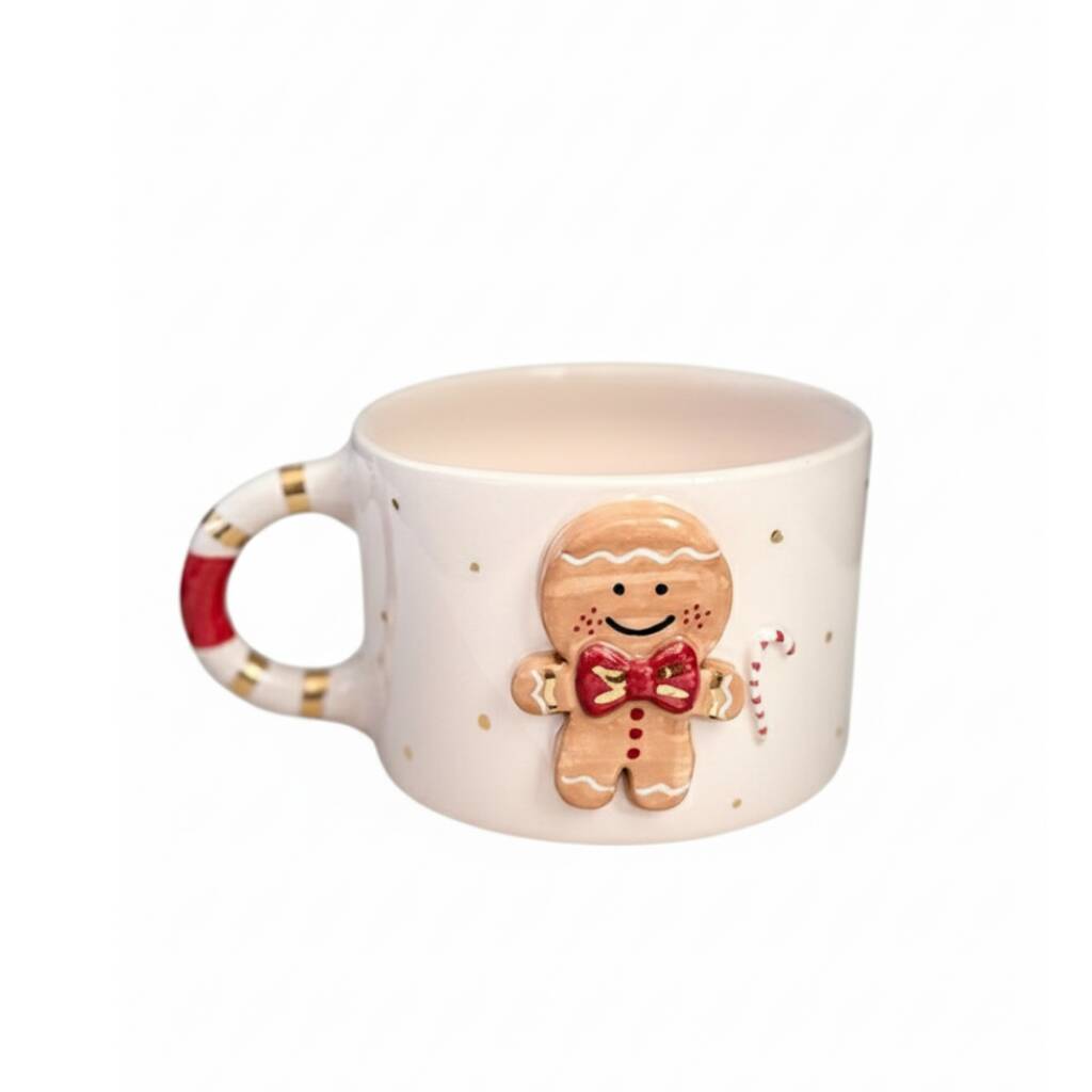 A festive handmade ceramic mug featuring a cheerful 3D gingerbread man with gold accents—perfect for cozy winter drinks and Christmas gifting.Bring the warmth of the holiday season to your daily rituals with this Handmade Gingerbread Man Ceramic Christmas Mug. Crafted from premium ceramic and decorated with a smiling raised gingerbread figure, this mug is finished with delicate hand-painted gold dots and a candy-cane inspired handle detail. Each piece is individually handmade and painted, giving every mug its own unique festive character. Ideal for hot chocolate, coffee, tea, or as a charming Christmas gift for loved ones of all ages.