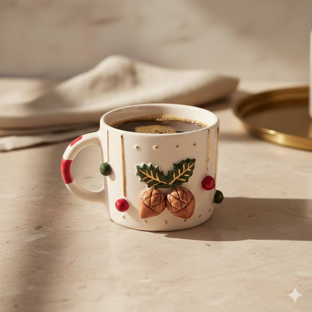 Handmade Pinecone And Holly Mug With 24ct Gold Festive Detailing