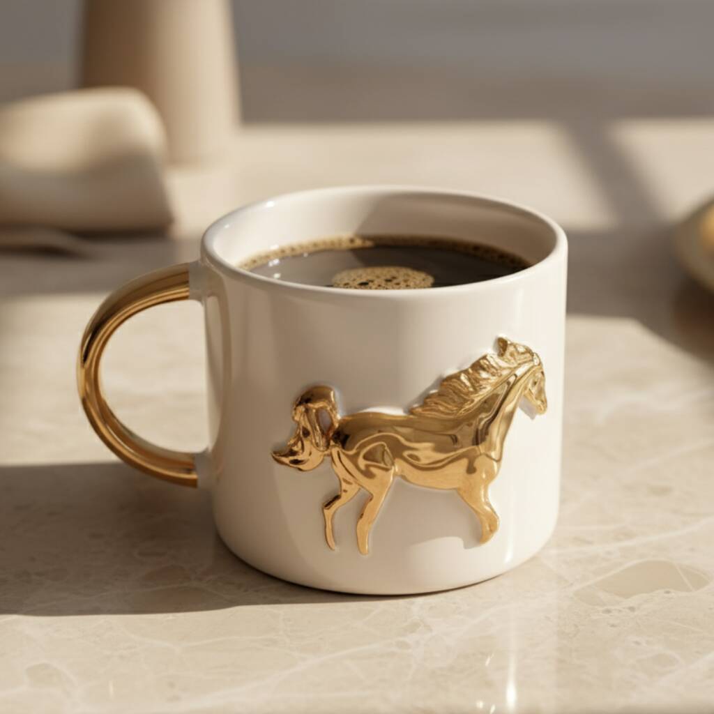 Handmade White Ceramic Mug With Gold Horse