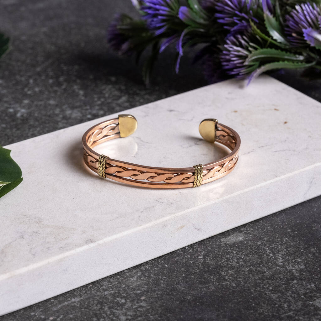 A beautifully braided copper cuff bracelet with golden ends—blending rustic elegance, natural healing charm, and timeless artisan style.Handcrafted from 100% pure copper, this open-cuff bracelet features a striking braided design and smooth golden end caps. Believed by many to support natural energy and wellbeing, copper makes this a meaningful gift with a touch of healing tradition. The flexible cuff style offers an adjustable fit for all wrist sizes, while the hand-twisted wires add texture and visual interest. Unisex and versatile, it’s ideal for everyday wear or as a thoughtful accessory with a story.