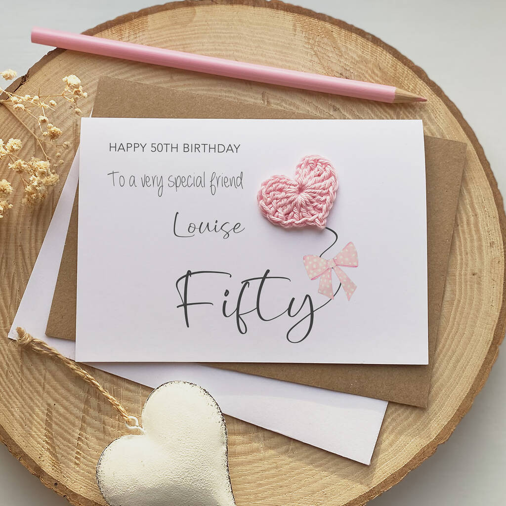 Personalised Pink Crochet Heart Best Friend 50th Birthday Card