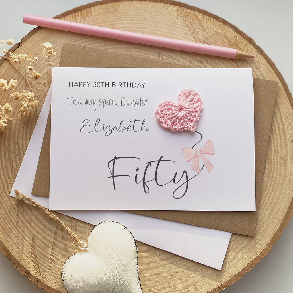 Personalised Pink Crochet Heart Daughter 50th Birthday Card