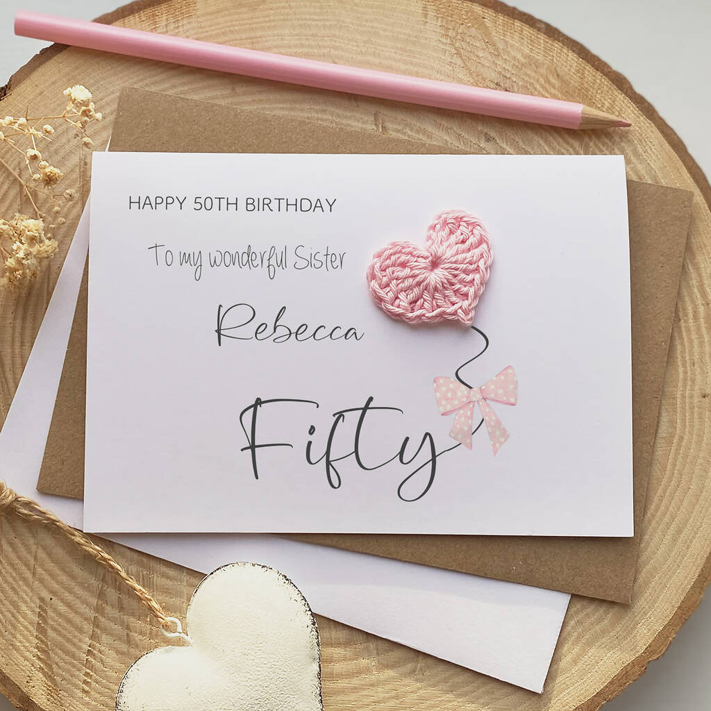 Personalised Pink Crochet Heart Sister 50th Birthday Card