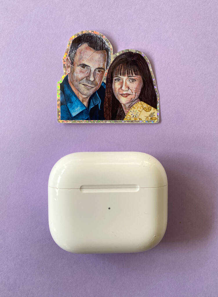 Relive the glory days of Aussie soap nostalgia with this 90s Neighbours Karl & Susan holographic sticker!Featuring a hand-drawn portrait of Ramsay Street’s iconic couple, this kitsch sticker sparkles with a rainbow holographic edge – perfect for fans of classic TV, retro vibes, and a touch of camp.