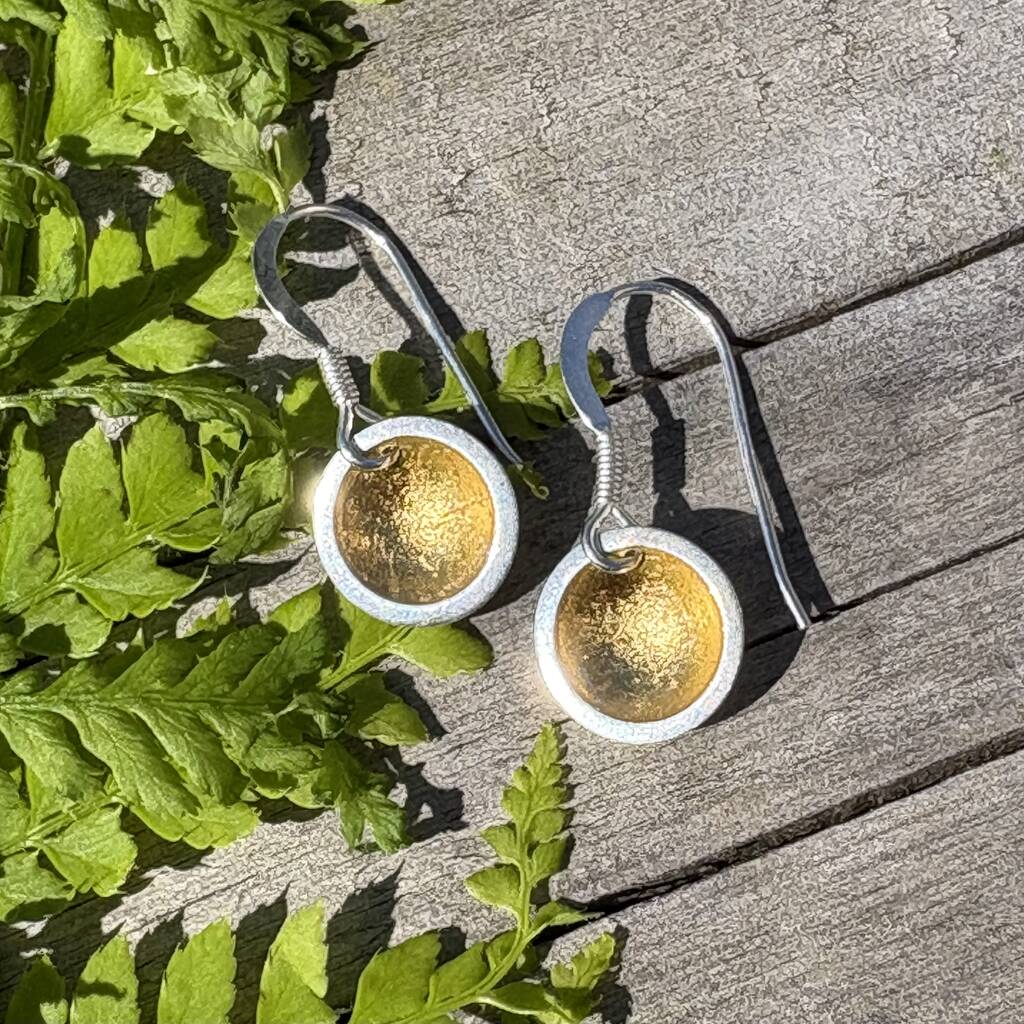 elegant simple handmade silver dome drop earrings lined with 24 ct gold leaf.