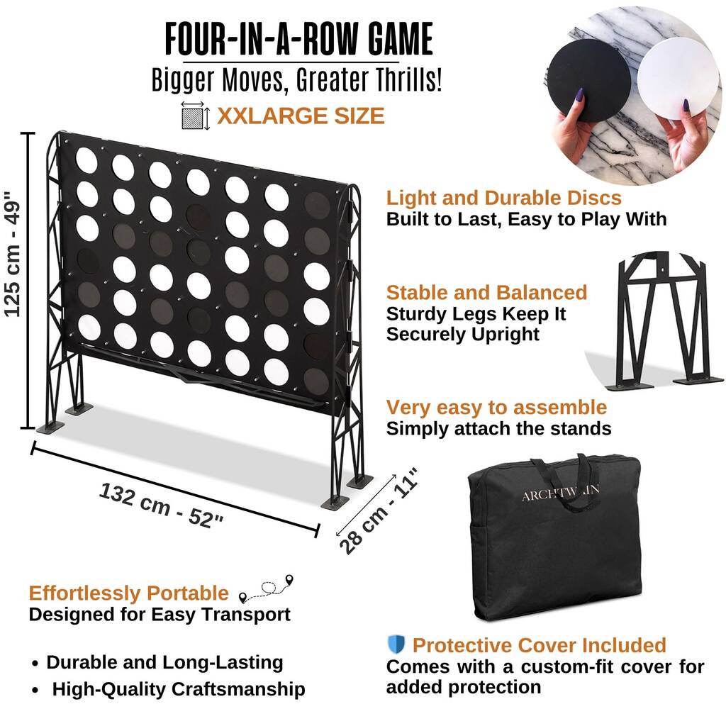 Make every event unforgettable with the Archtwain Giant Size Four in a Row! This oversized, crowd-pleasing version of the classic game is designed to add excitement and energy to game nights, backyard parties, and special occasions. Built for versatility and style, it stands strong as a decorative piece when not in play, ready to bring friends and family together at a moment’s notice. With the Archtwain Giant Size Four-in-a-Row, bring the thrill of friendly competition to any space, indoors or out.