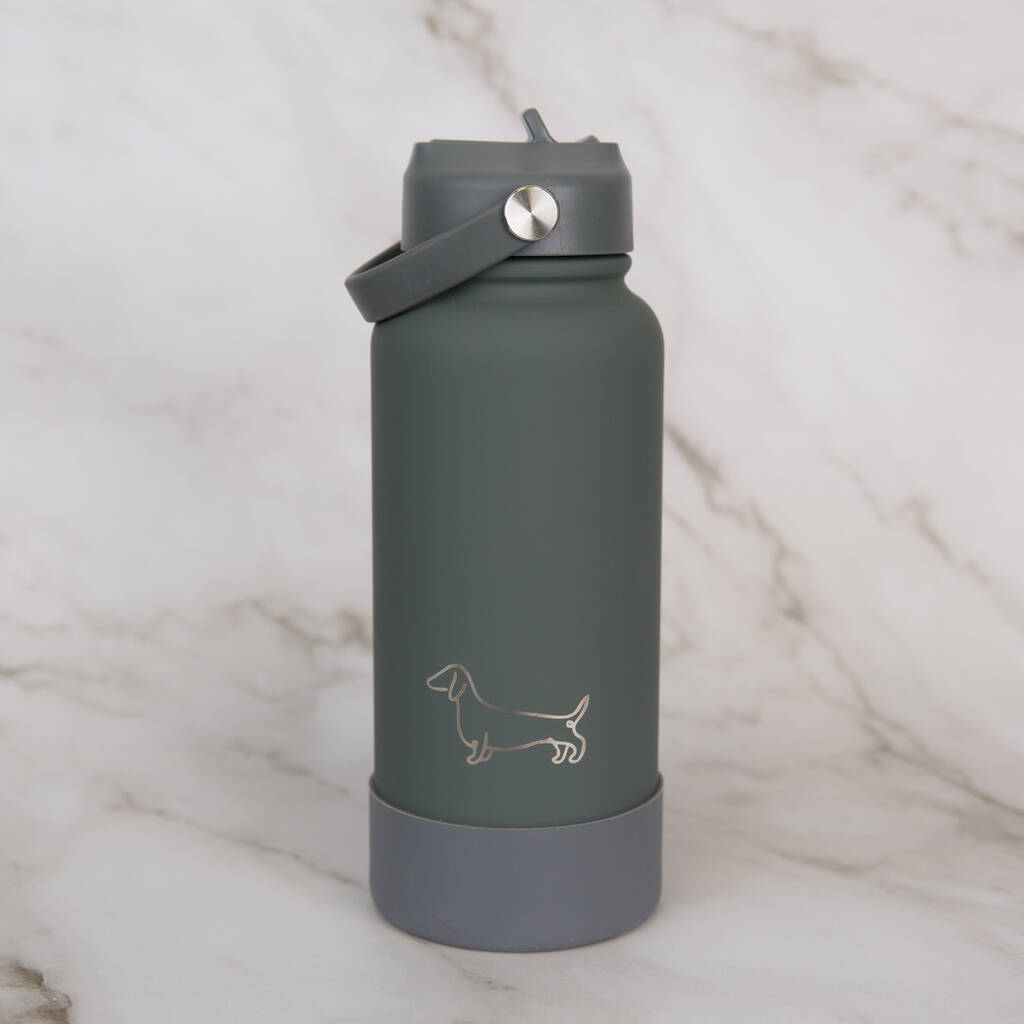 A beautiful sausage dog engraved water drinks bottle that is temperature controlled keeping cold drinks nice and cold and hot drinks nice and hot. There is also a removable silicone bowl on the bottom of the bottle that comes off for cold drinks on the go for your furry pal. It holds just under a litre of water at 0.90l.