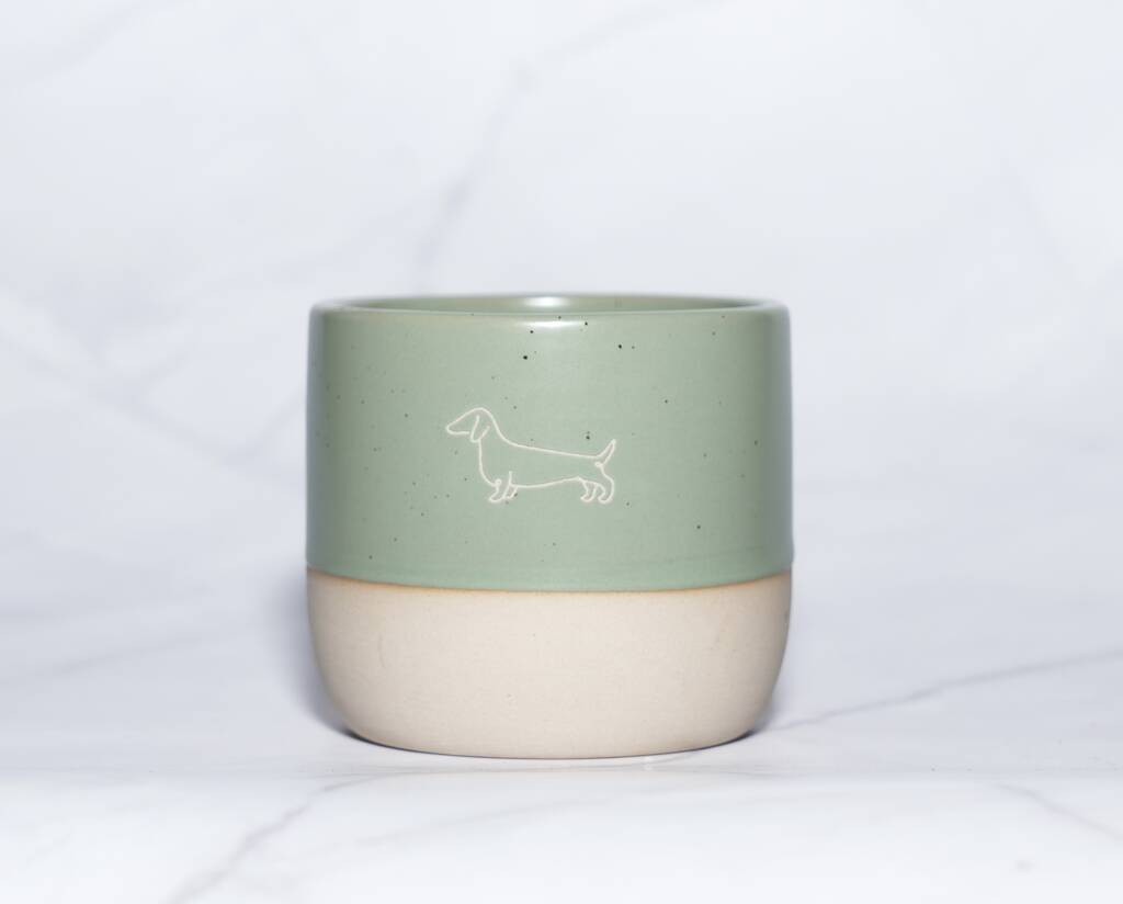 Dachshund Engraved Ceramic Flat White Tumbler In Sage Green