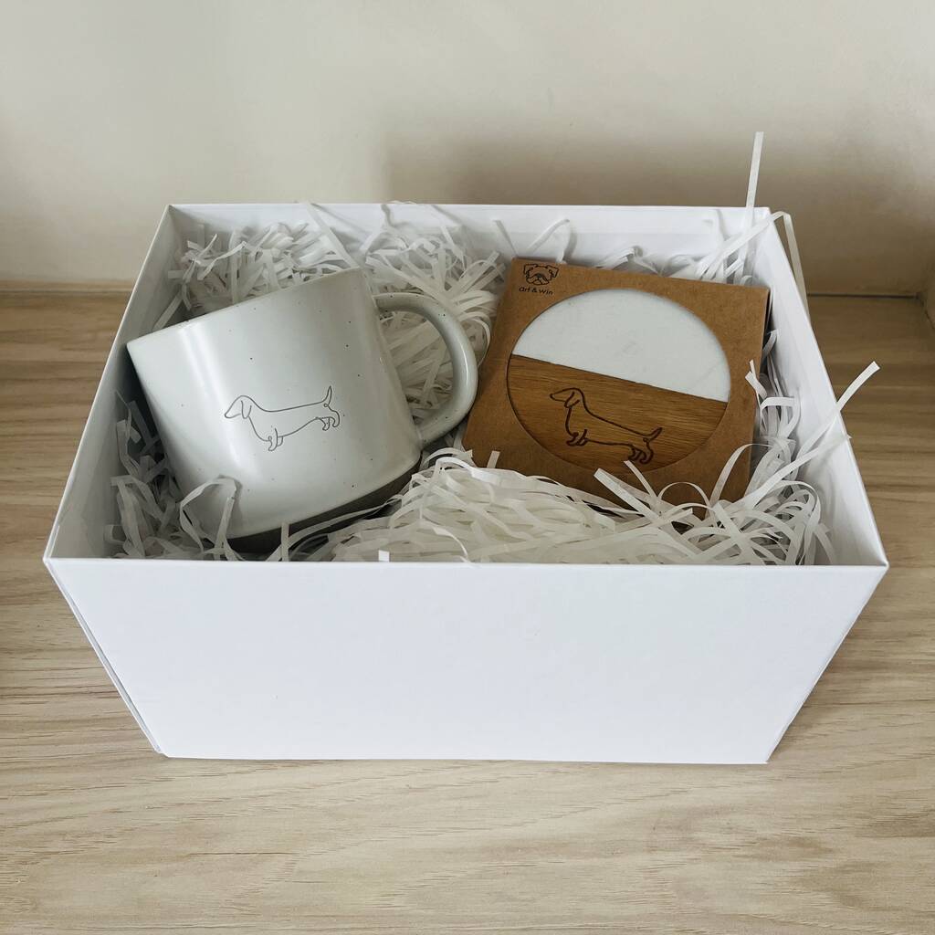 • Dachshund Gift Box With Tea/ Coffee Mug And Engraved Wood And Marble Coaster Presented In A Gift Box, thumbnail 7 of 7