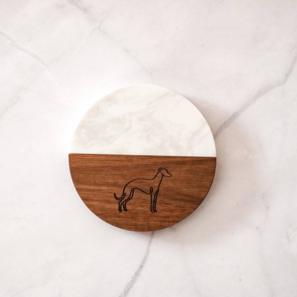 Sighthound/ Greyhound/ Whippet Engraved Acacia Wood And White Marble Coaster In Gift Box