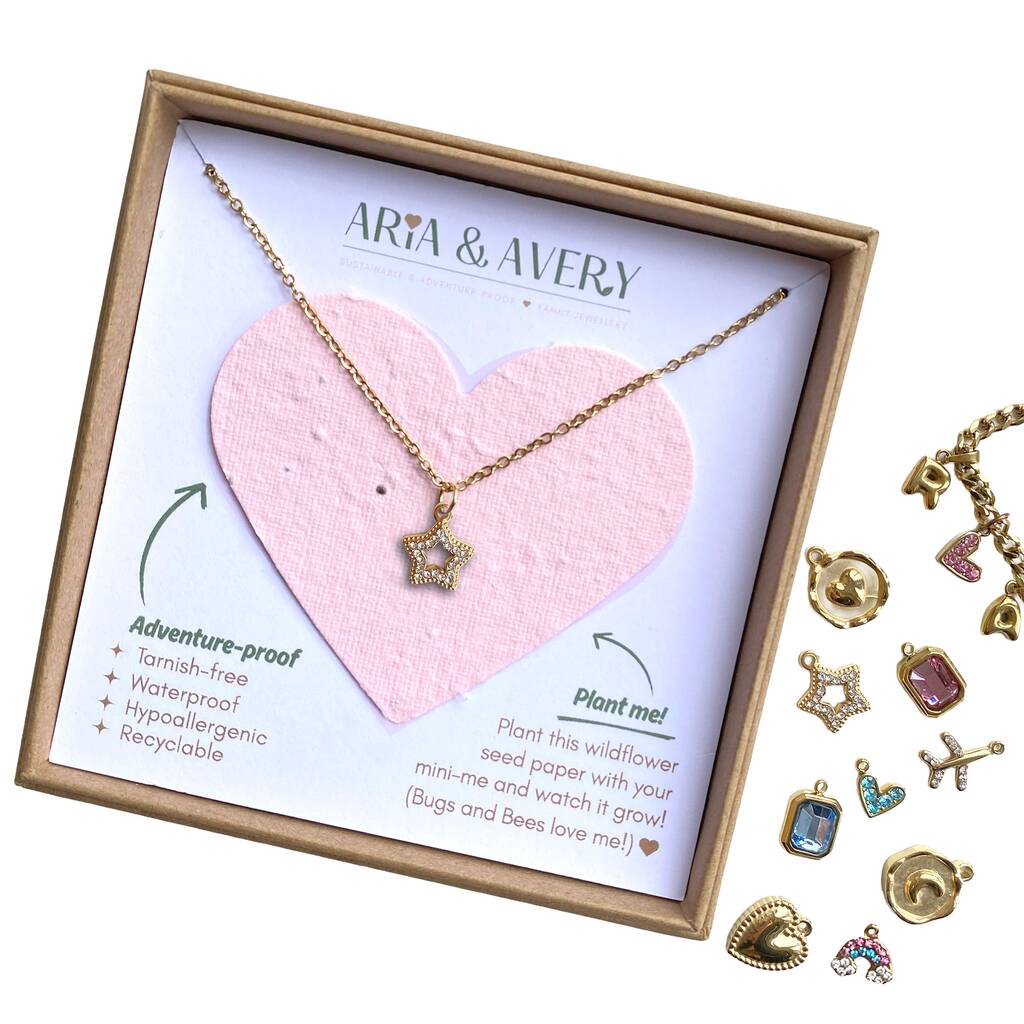 This beautiful gift box contains a stunning 18k gold hypoallergenic, waterproof, tarnish-free children's necklace and special 'plant-a-heart' seed paper.Our gorgeous hand-pressed plantable paper hearts use cotton waste from the textile industry and are embedded with wild flower seeds for you to plant. Much better than a bunch of flowers if you ask us, a gift from Aria & Avery will be remembered and cherished for a lifetime.