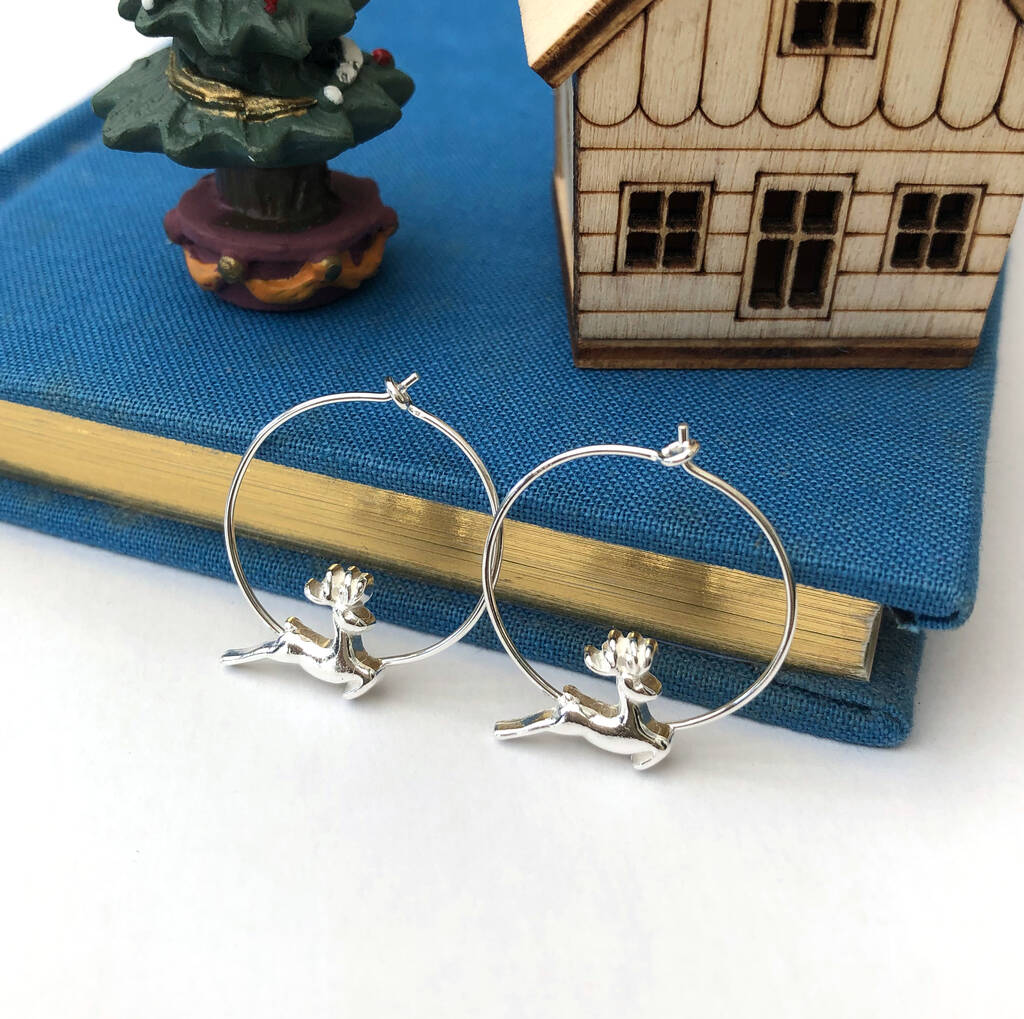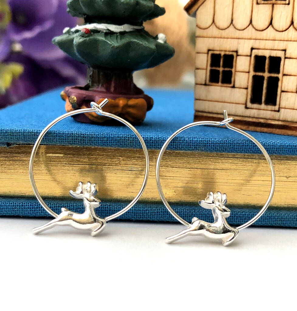 Sterling Silver Reindeer Christmas Hoop Earrings