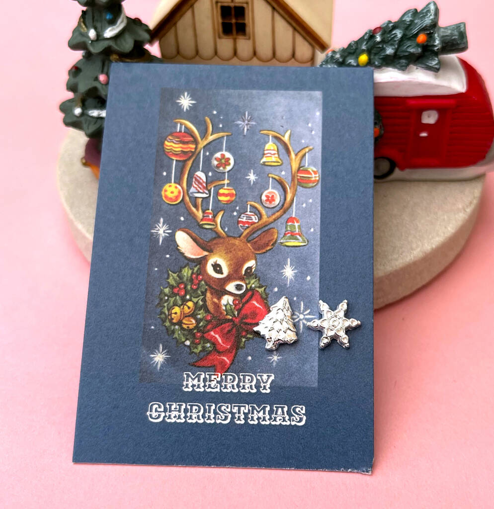 These mismatched snowflake and Christmas tree earrings offering a playful festive touch. A delicate seasonal accessory perfect for gifting, winter outfits, and adding holiday-inspired charm.