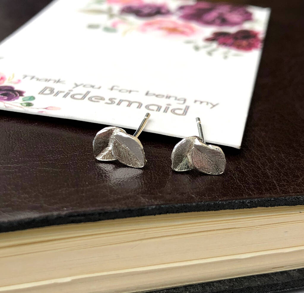 Thank you bridesmaid sterling silver mini leaf earrings, a thoughtful wedding keepsake gift for bridesmaids, maid of honour, and bridal party celebrations.