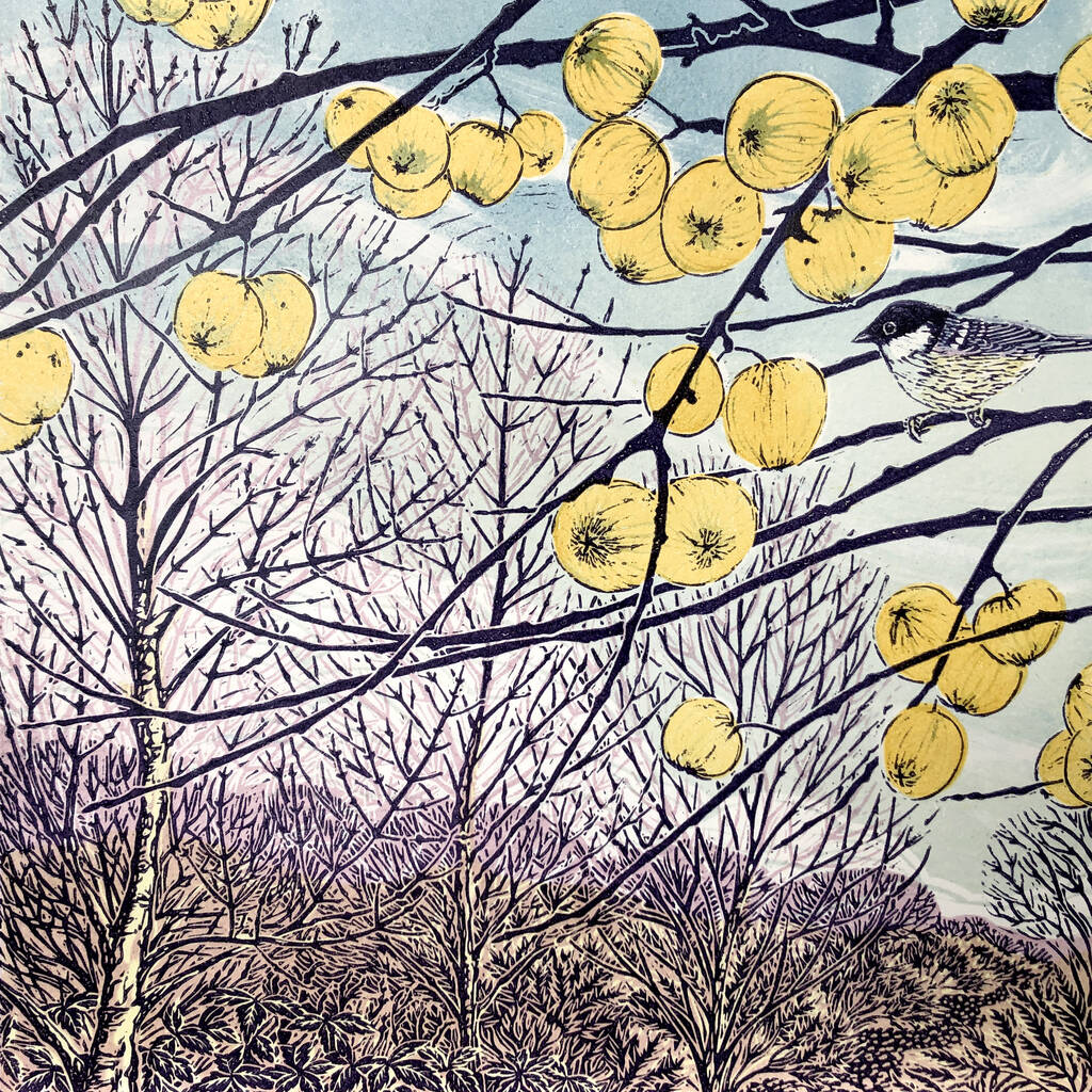 This lino print was inspired by the vibrant winter crab apples and the birds that visit the apple tree in the hedgerow beside my studio.