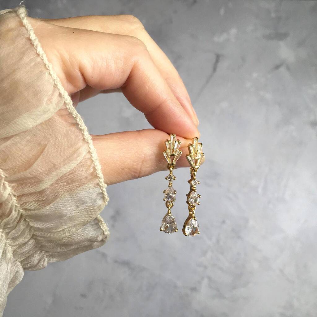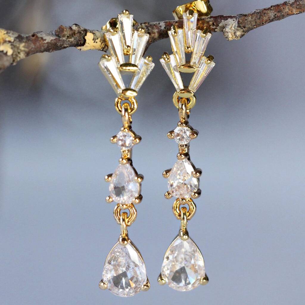 Featuring cubic zirconia and glass crystals set into hypoallergenic 18k gold plated brass settings, with post ear fitting. These earrings measure 38mm total length, and are very lightweight and easy to wear.