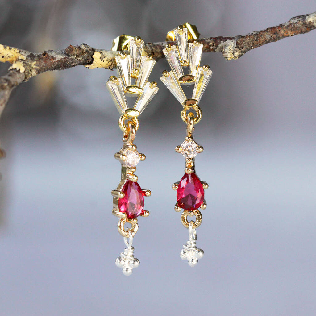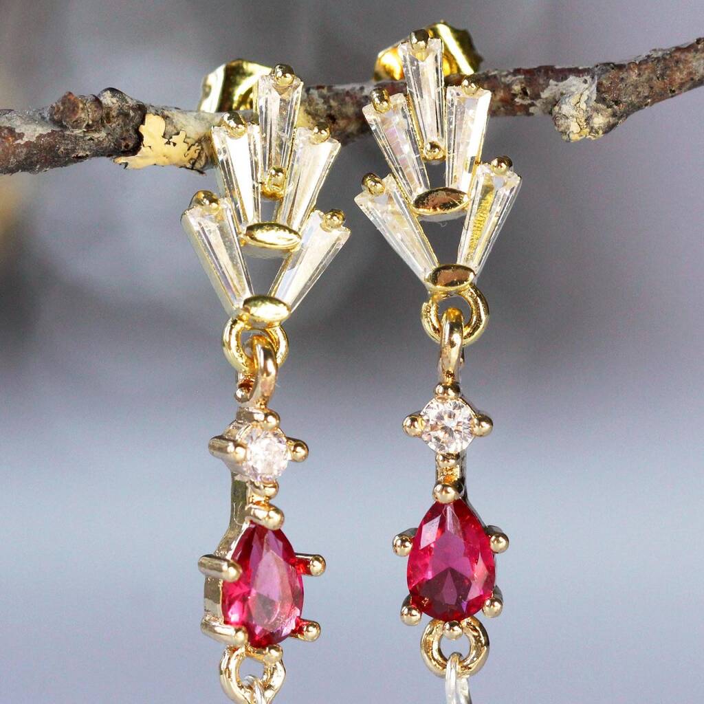 Featuring cubic zirconia and glass crystals set into hypoallergenic 18k gold plated brass settings, with post ear fitting. These earrings measure 35mm total length, and are very lightweight and easy to wear.