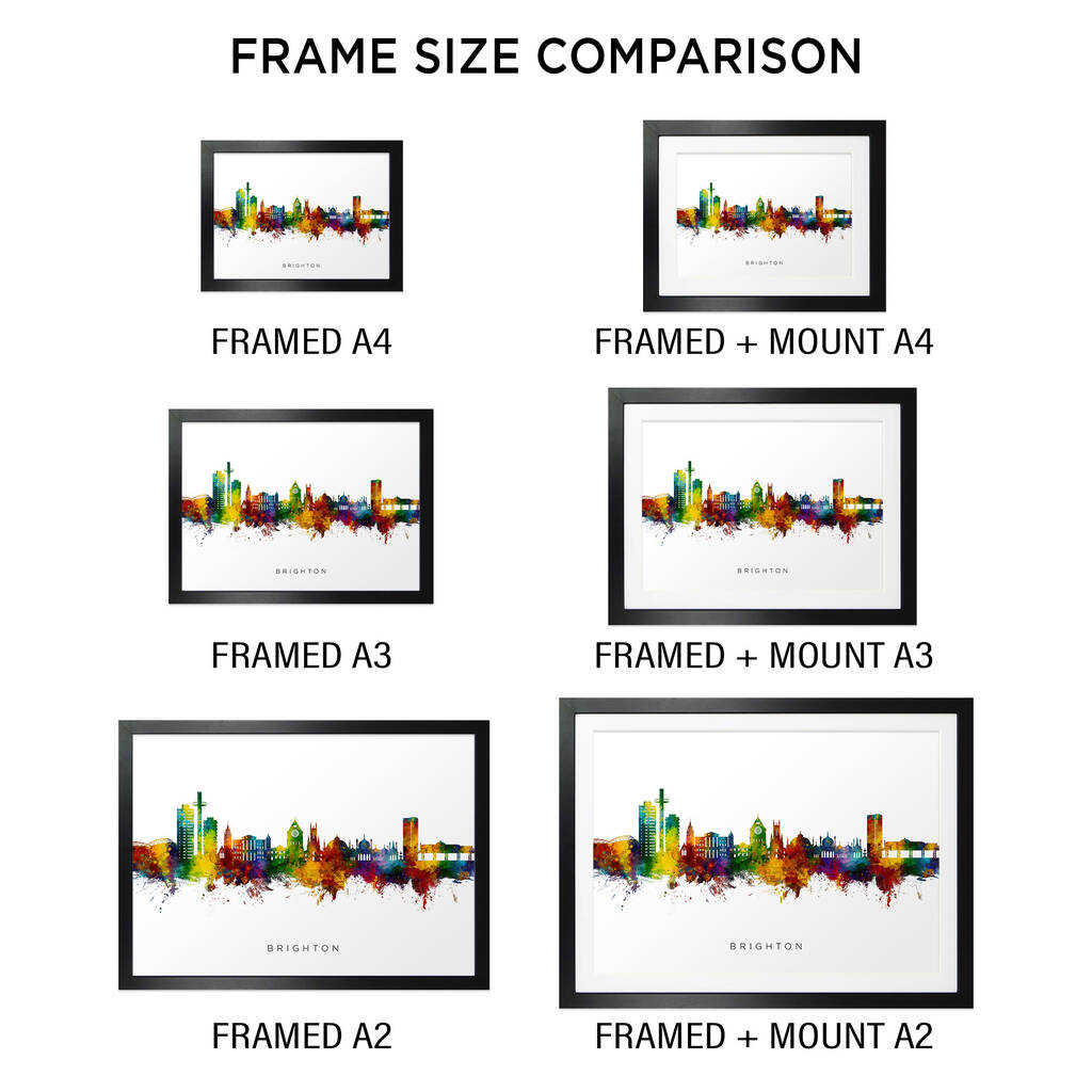 Frames are available for print sizes A4, A2, A3 and 50x70cm. The final size, including the frame, are +2.2cm each side for frames without a mount, +4.5cm each side for frames with a mount.