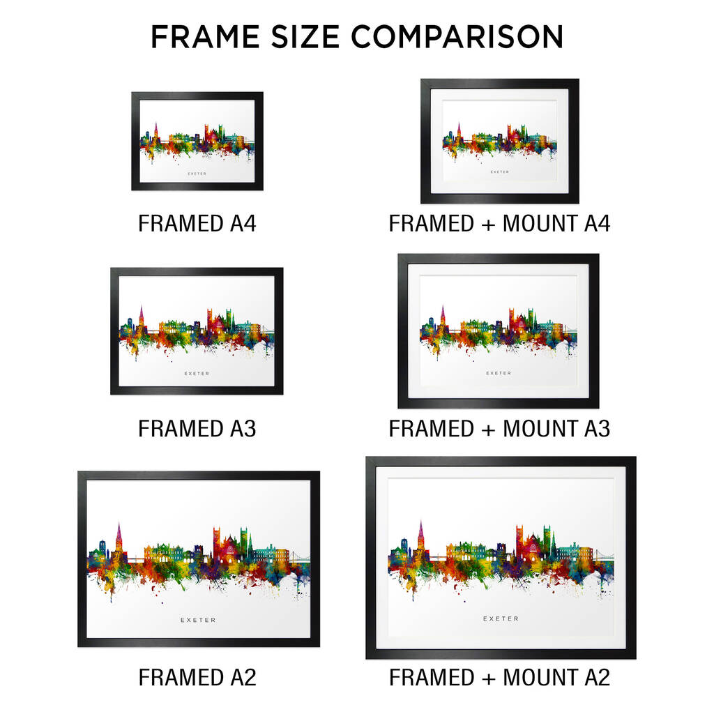 Frames are available for print sizes A4, A2, A3 and 50x70cm. The final size, including the frame, are +2.2cm each side for frames without a mount, +4.5cm each side for frames with a mount.