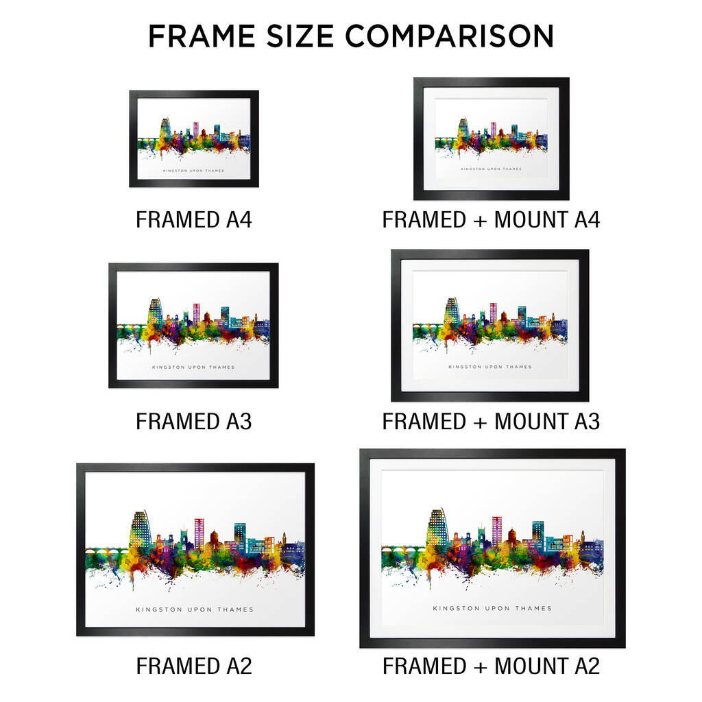 Frames are available for print sizes A4, A2, A3 and 50x70cm. The final size, including the frame, are +2.2cm each side for frames without a mount, +4.5cm each side for frames with a mount.