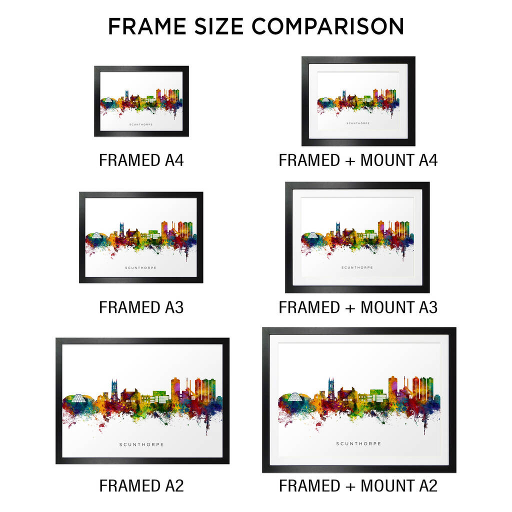 Frames are available for print sizes A4, A2, A3 and 50x70cm. The final size, including the frame, are +2.2cm each side for frames without a mount, +4.5cm each side for frames with a mount.