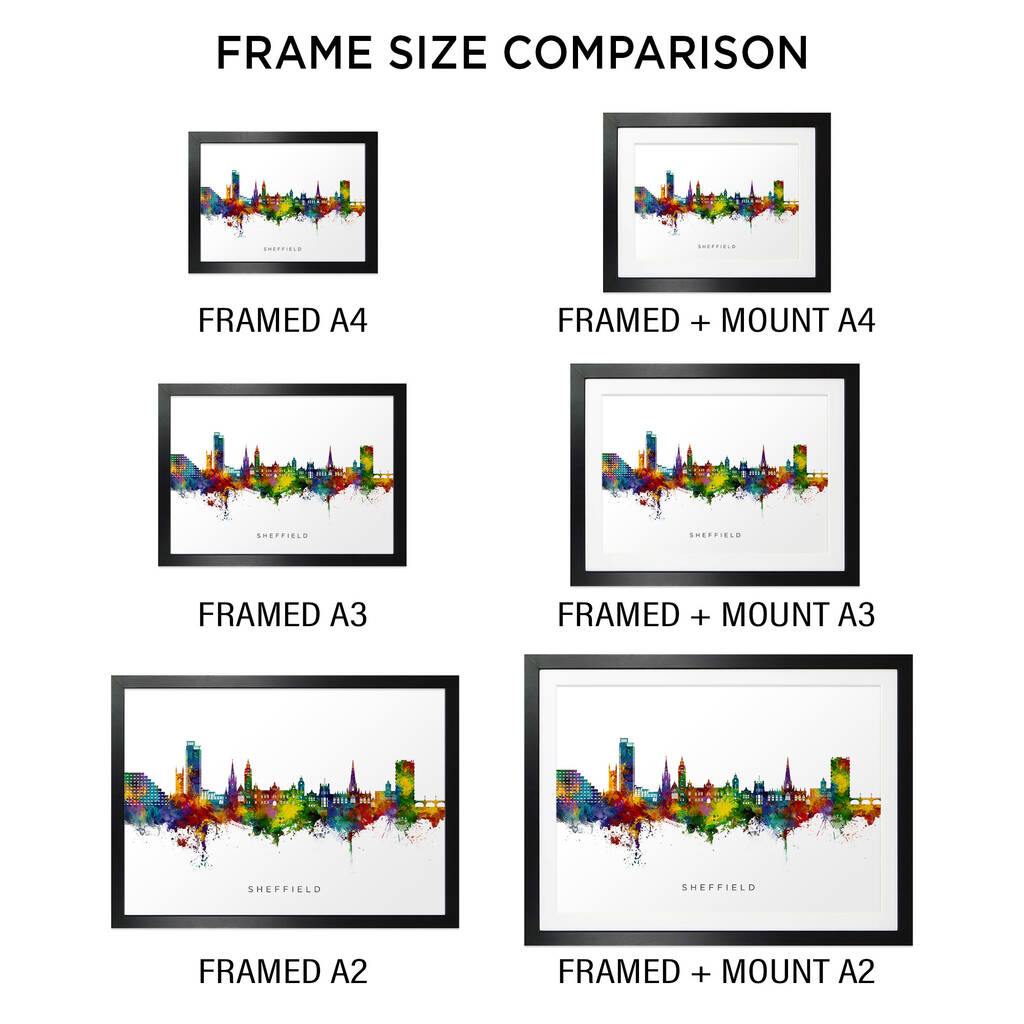 Frames are available for print sizes A4, A2, A3 and 50x70cm. The final size, including the frame, are +2.2cm each side for frames without a mount, +4.5cm each side for frames with a mount.