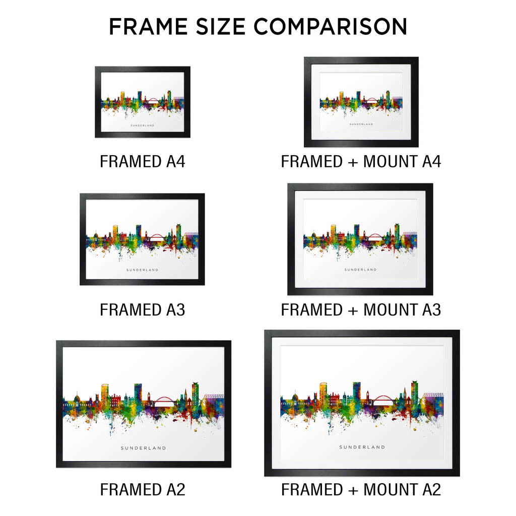 Frames are available for print sizes A4, A2, A3 and 50x70cm. The final size, including the frame, are +2.2cm each side for frames without a mount, +4.5cm each side for frames with a mount.