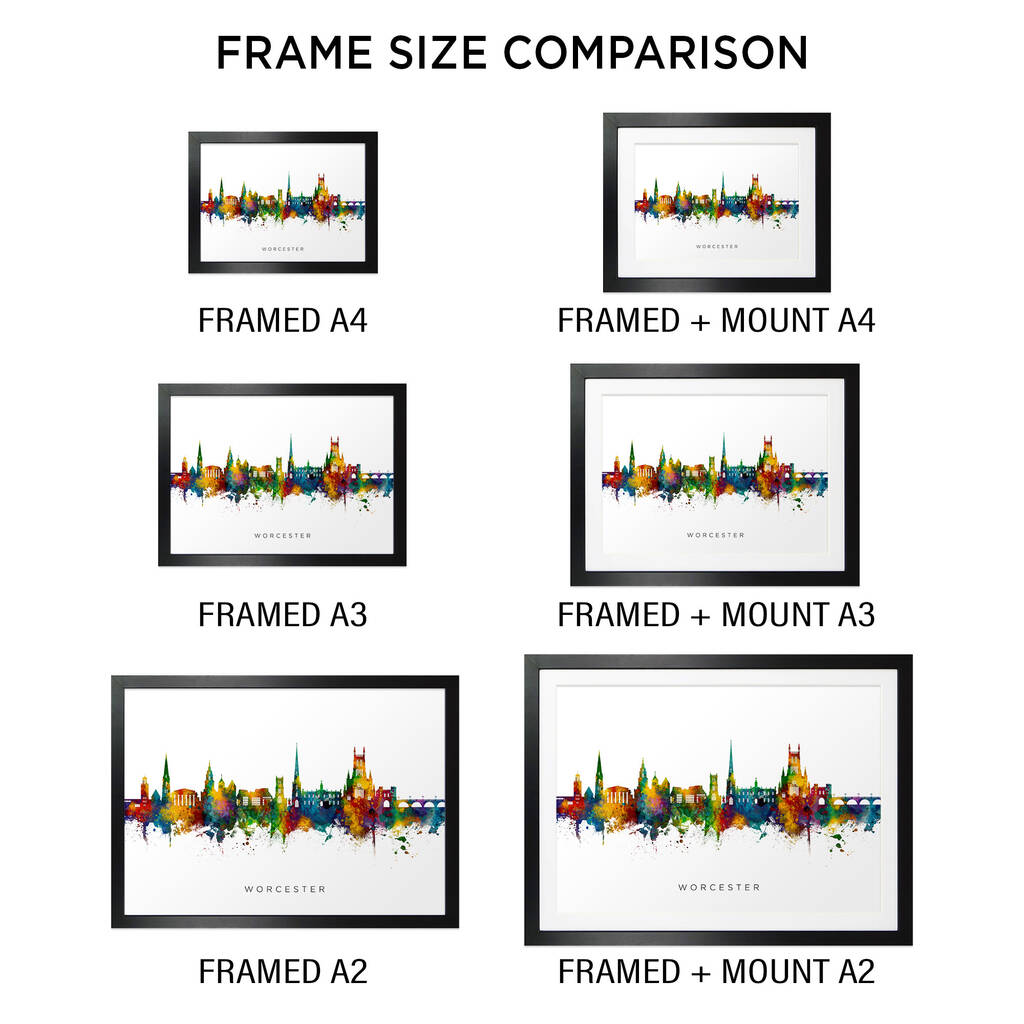 Frames are available for print sizes A4, A2, A3 and 50x70cm. The final size, including the frame, are +2.2cm each side for frames without a mount, +4.5cm each side for frames with a mount.