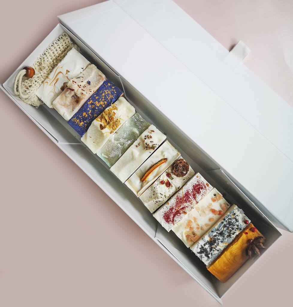 • 12 handmade, natural cold process soap bars