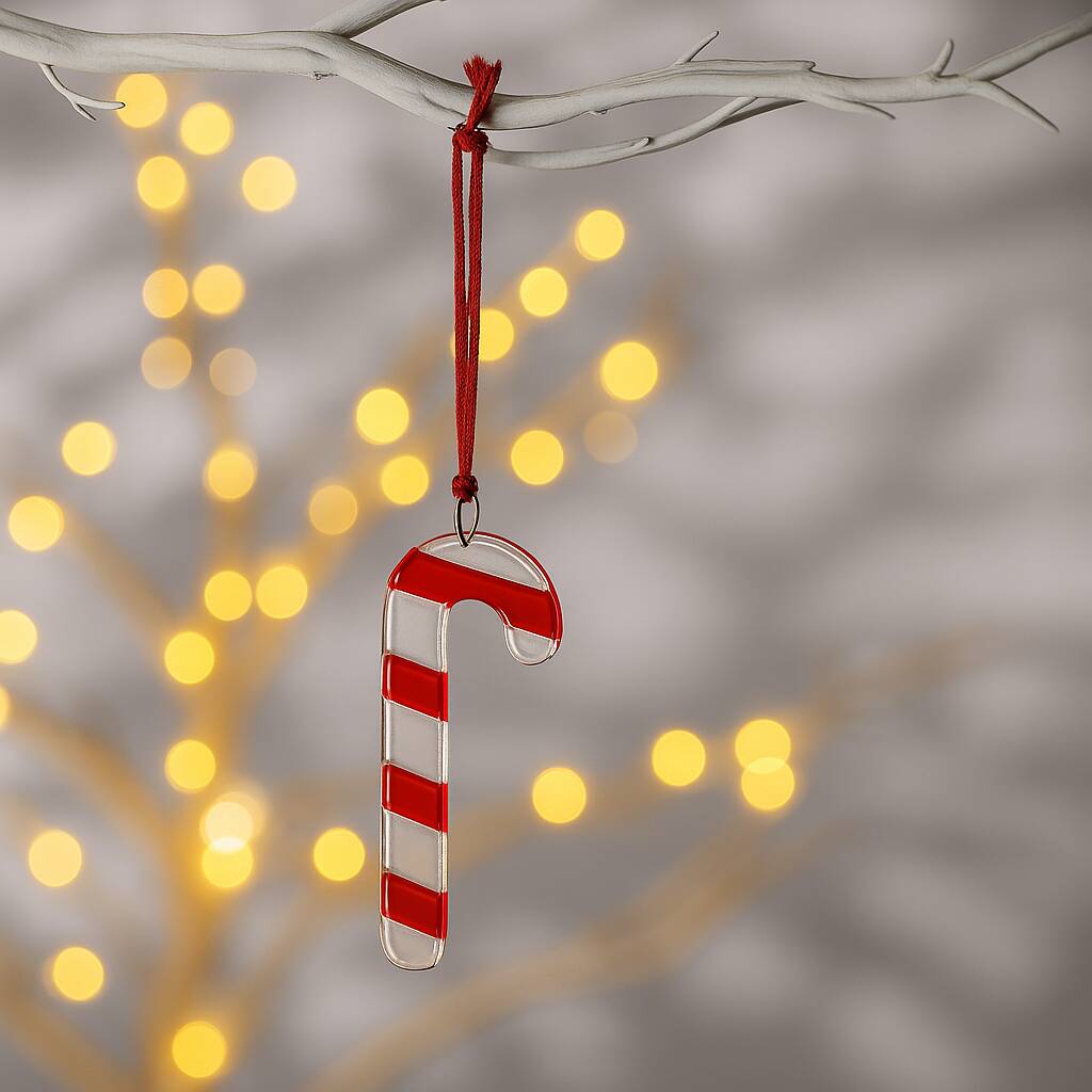 Beautiful fused glass candy cane ornament featuring classic red and white stripes, perfect for adding traditional charm to your holiday decorationsThis handmade fused glass candy cane ornament is a festive classic with a modern twist. Featuring bold red and clear glass stripes, it’s the perfect decoration to hang on the Christmas tree, adorn a wreath, or add to a seasonal table display. Each piece is handcrafted, making every candy cane unique. The glossy glass finish sparkles in the light, bringing a touch of festive magic to your décor. A timeless Christmas decoration that also makes a wonderful small gift or stocking filler.