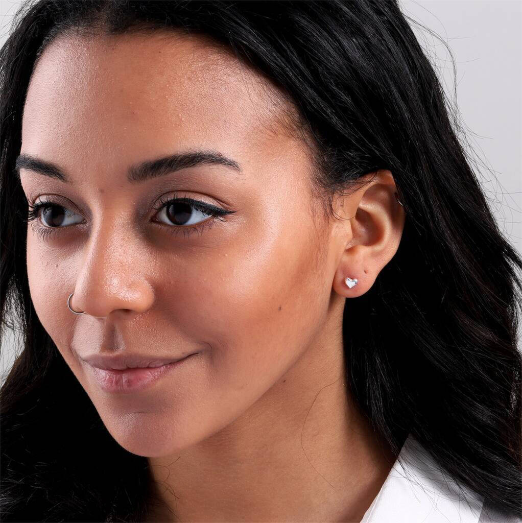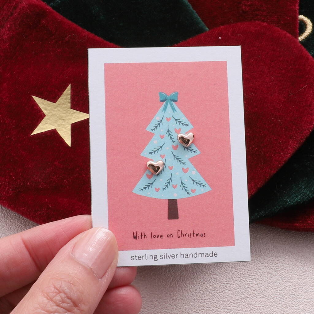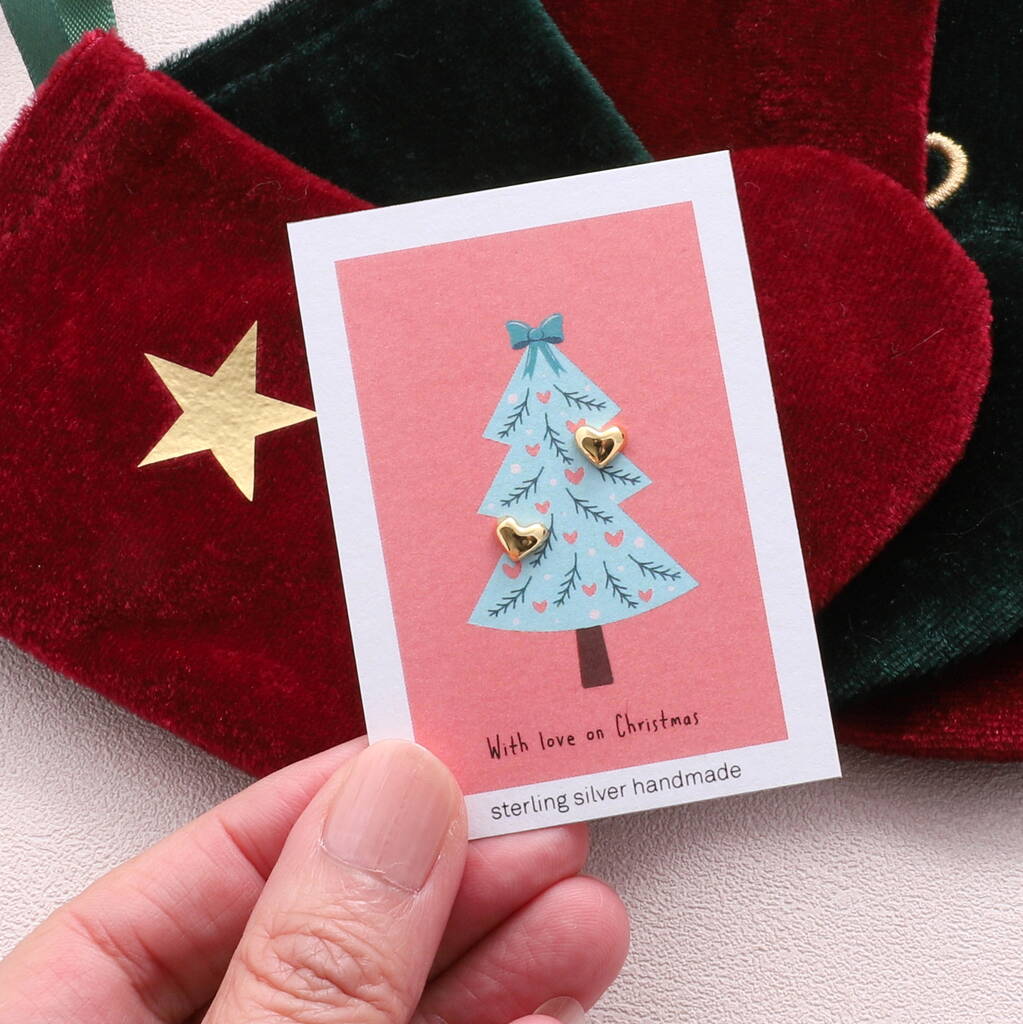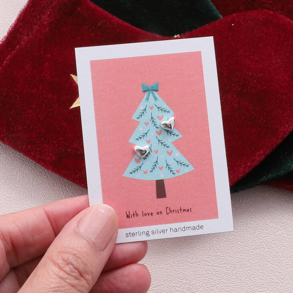 A sweet pair of sterling silver heart earrings packed in a red stocking which can be personalised
