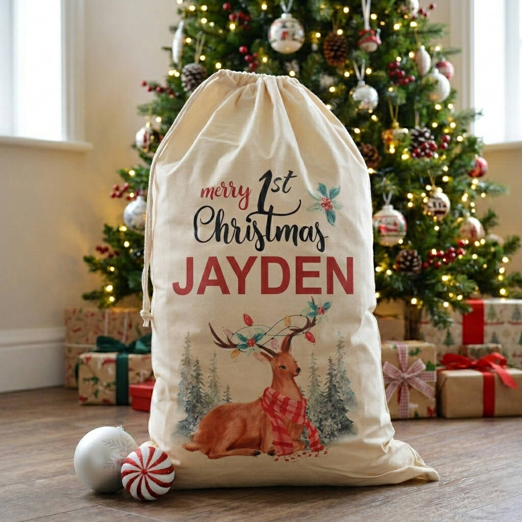 Personalised 1st Christmas Deer Cotton Christmas Sack