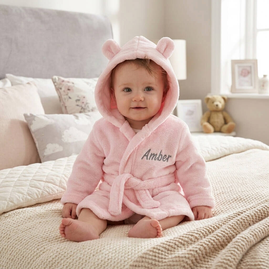 Personalised Pink Baby Dressing Gown With Ears On Hood
