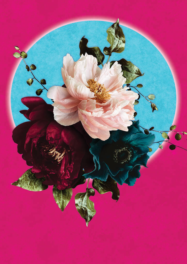 A vibrant floral artwork featuring soft blush, deep burgundy and rich teal blooms set against a bold pink backdrop, centred around a glowing turquoise moon. This striking colour contrast creates a sense of modern romance with a celestial twist.