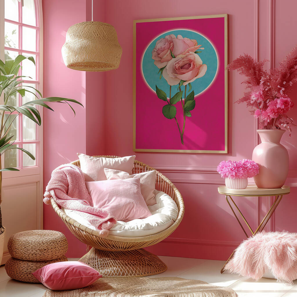 Soft blush roses unfold gracefully against a vibrant rose-pink background, framed by a luminous turquoise halo that brings contrast, warmth and contemporary elegance. The result is a striking composition that feels expressive and confident, while remaining tender and romantic.