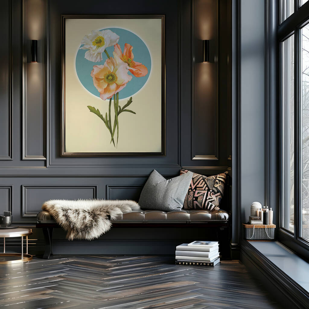 Soft peach and ivory poppies bloom gracefully against a warm neutral background, framed by a gentle blue circular halo that brings calm balance and light to the composition. The delicate petals and airy colour palette create a soothing artwork that feels reflective, elegant and quietly powerful.