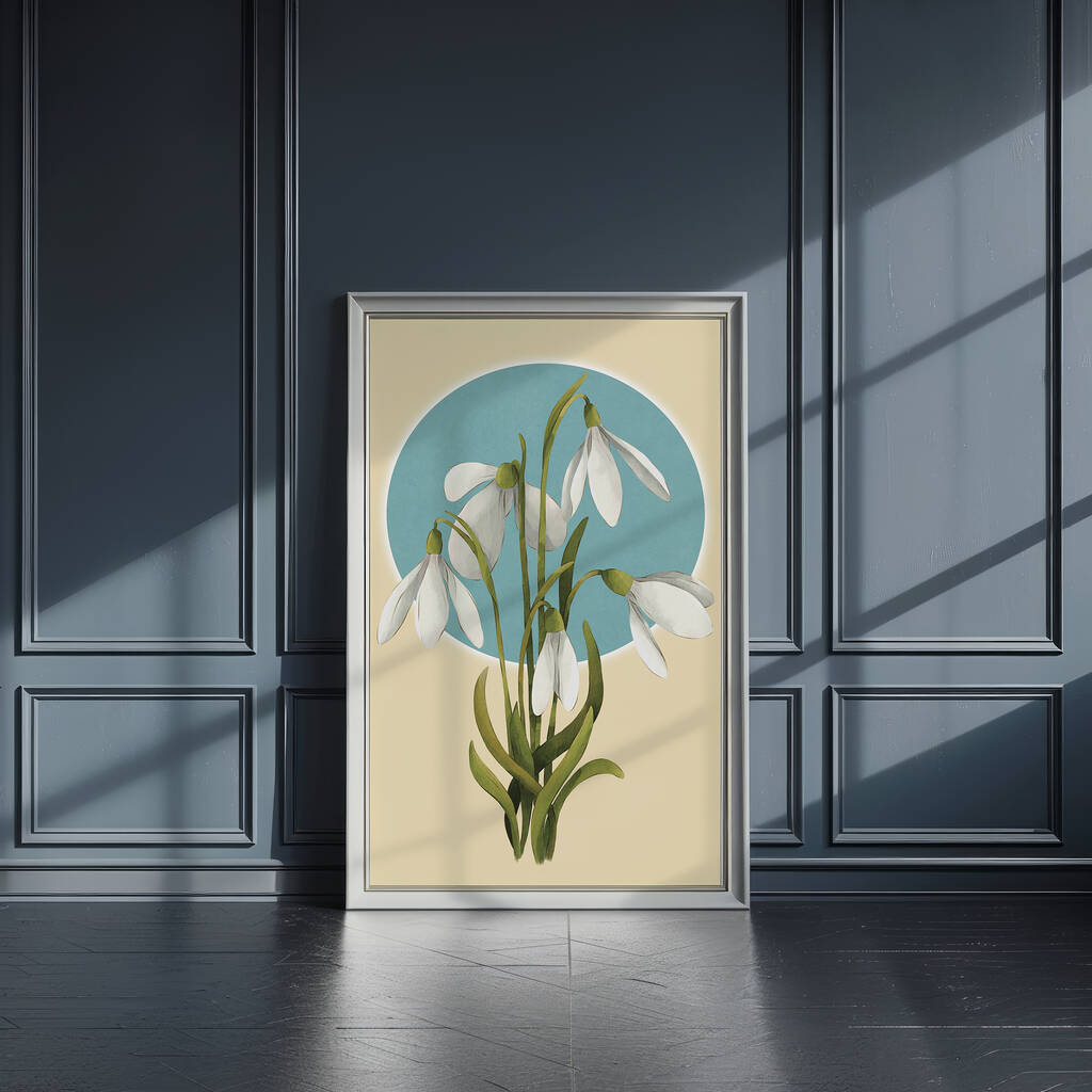 Graceful white snowdrops rise delicately against a warm, neutral background, framed by a soft blue circular halo that brings balance and tranquillity to the composition. The muted colour palette creates a light, airy feel, making this piece ideal for peaceful interiors and minimalist spaces.