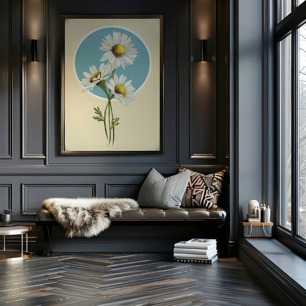 A fresh daisy art print symbolising innocence and joy, featuring soft white blooms framed by a calming blue halo.